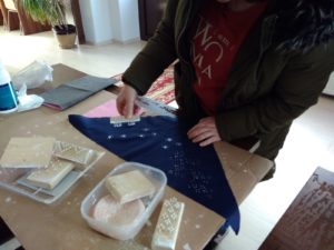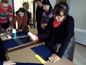 Uczestnicy spotkań dowiedzieli się z prelekcji multimedialnej podstawowych wiadomości o lnie, o roślinie indygowca z którego uzyskuje się barwnik, płóciennictwie i drukowaniu tkanin, o zachowanym budynku farbiarni w Orawce i jej rekonstrukcji z lat 20 tych XX w. w Orawskim Parku Etnograficznym. Część warsztatowa polegała na tym, że biorący udział własnoręcznie zadrukowali farbą akrylową przy użyciu prostych „klocków” kawałek tkaniny w kolorze granatowym. Uczestnicy warsztatów wykazali się ogromną inwencją twórczą, a tkanina zabrana do domu, będzie im przypominać o tej niezwykłej części dziedzictwa Orawy.